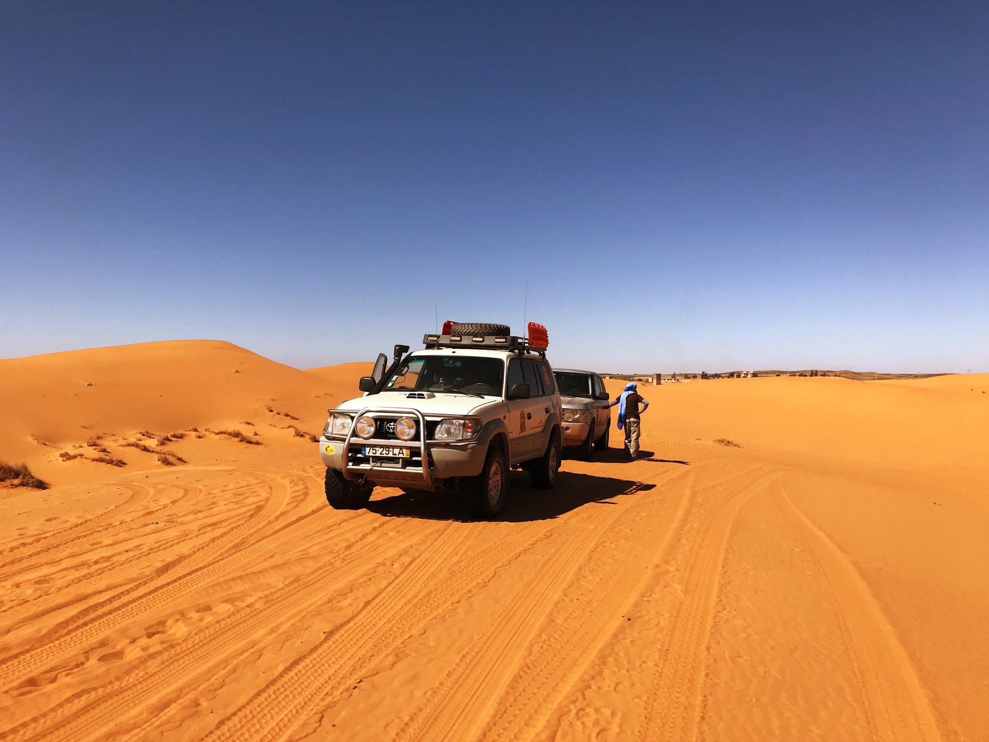 - ✔️ Acompanhamento de guia local profissional nas zonas remotas do deserto e formação de condução em dunas